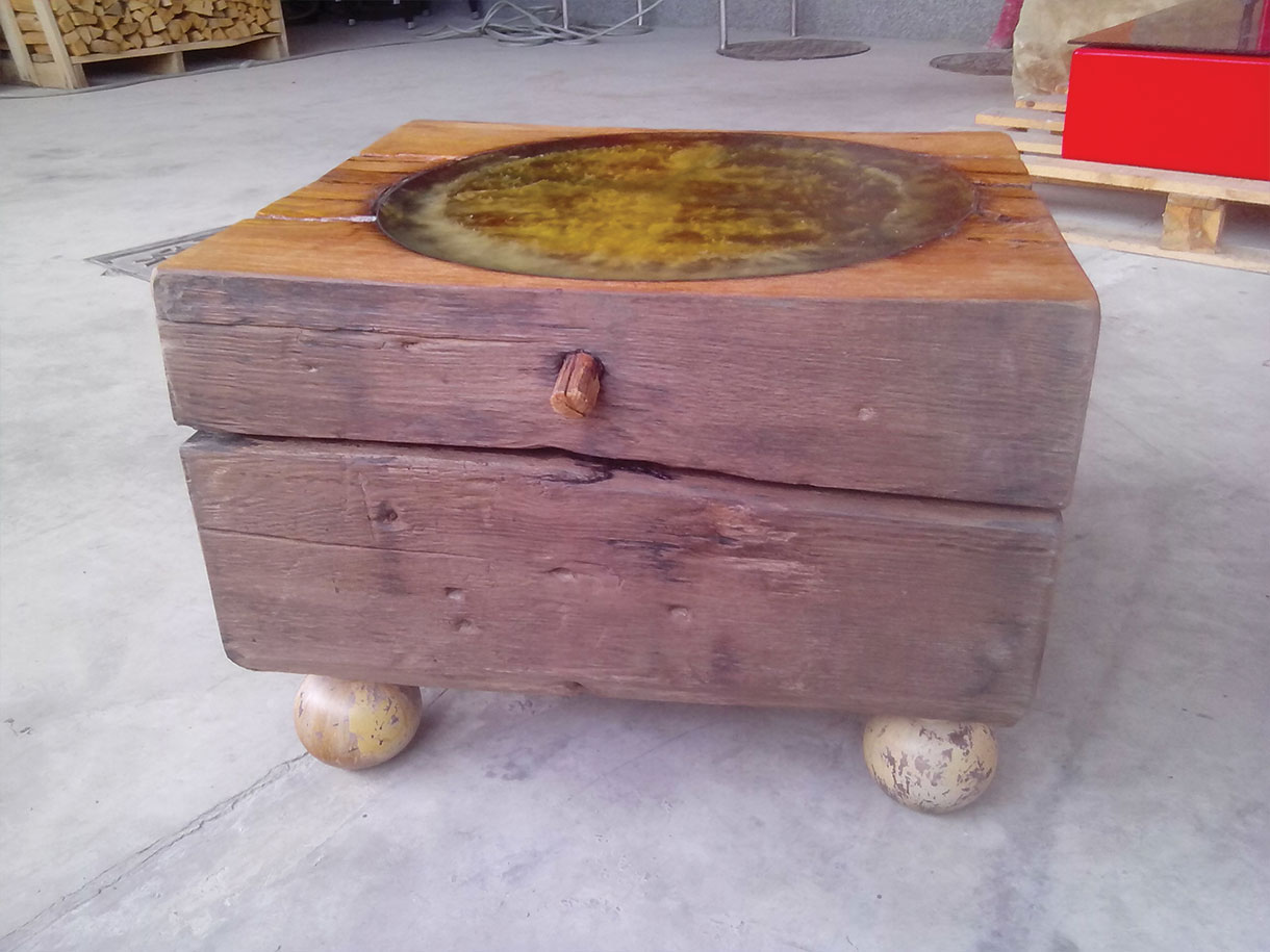 Je izdelana iz že, za nekatere, odsluženega lesa, večinoma iz starih preš. Mi znamo ta les primerno obdelati in zaščititi. Tako ohranjamo gozdove, izdelki iz starega pa imajo poseben čar in nostalgično privlačnost. Dodana oblikovna vrednost tem mizicam, pa je lahko tudi epoksi.